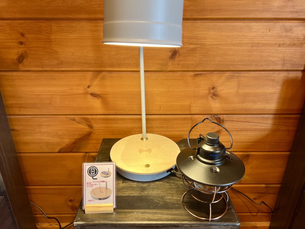颪 OROSHIのベッドサイドにあるランプはスマートフォン充電器を兼ねていて、